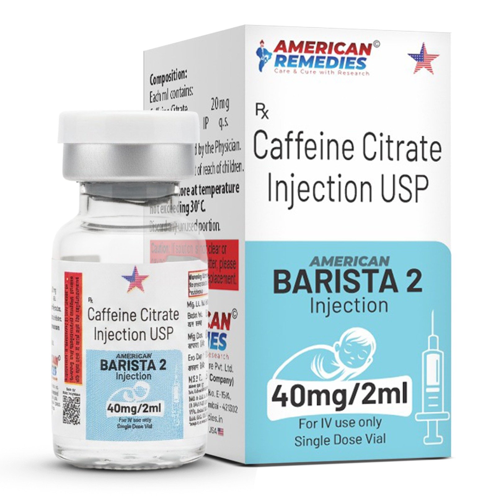 Barista 2 Caffeine Citrate Injection USP 40mg/2ml is a prescription medication used for the short-term treatment of apnea of prematurity in infants.