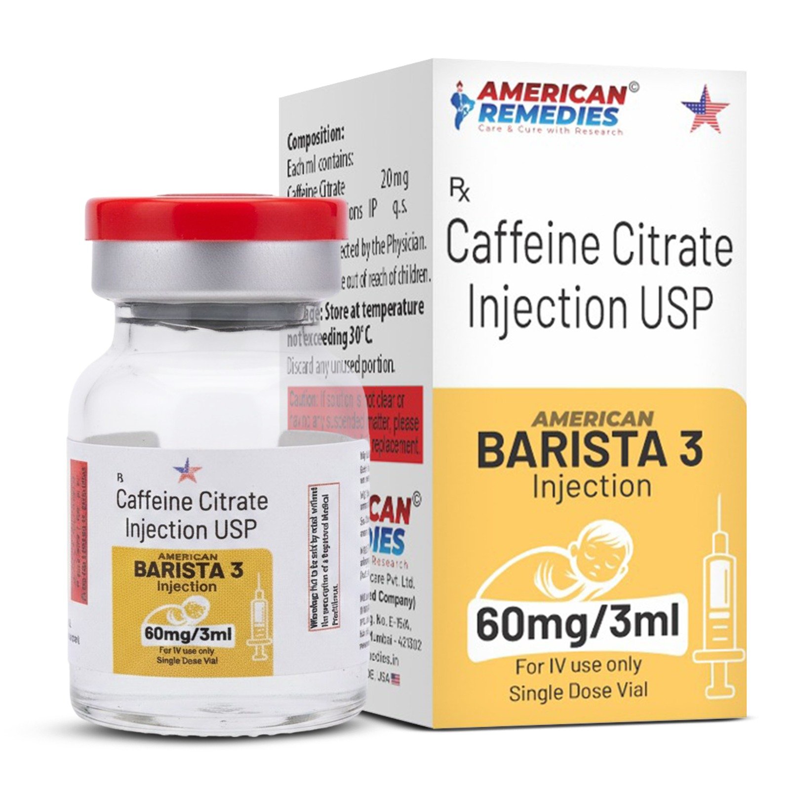 Barista 3 Caffeine Citrate Injection USP 60mg/3ml is a prescription medication used for the short-term treatment of apnea of prematurity in infants.