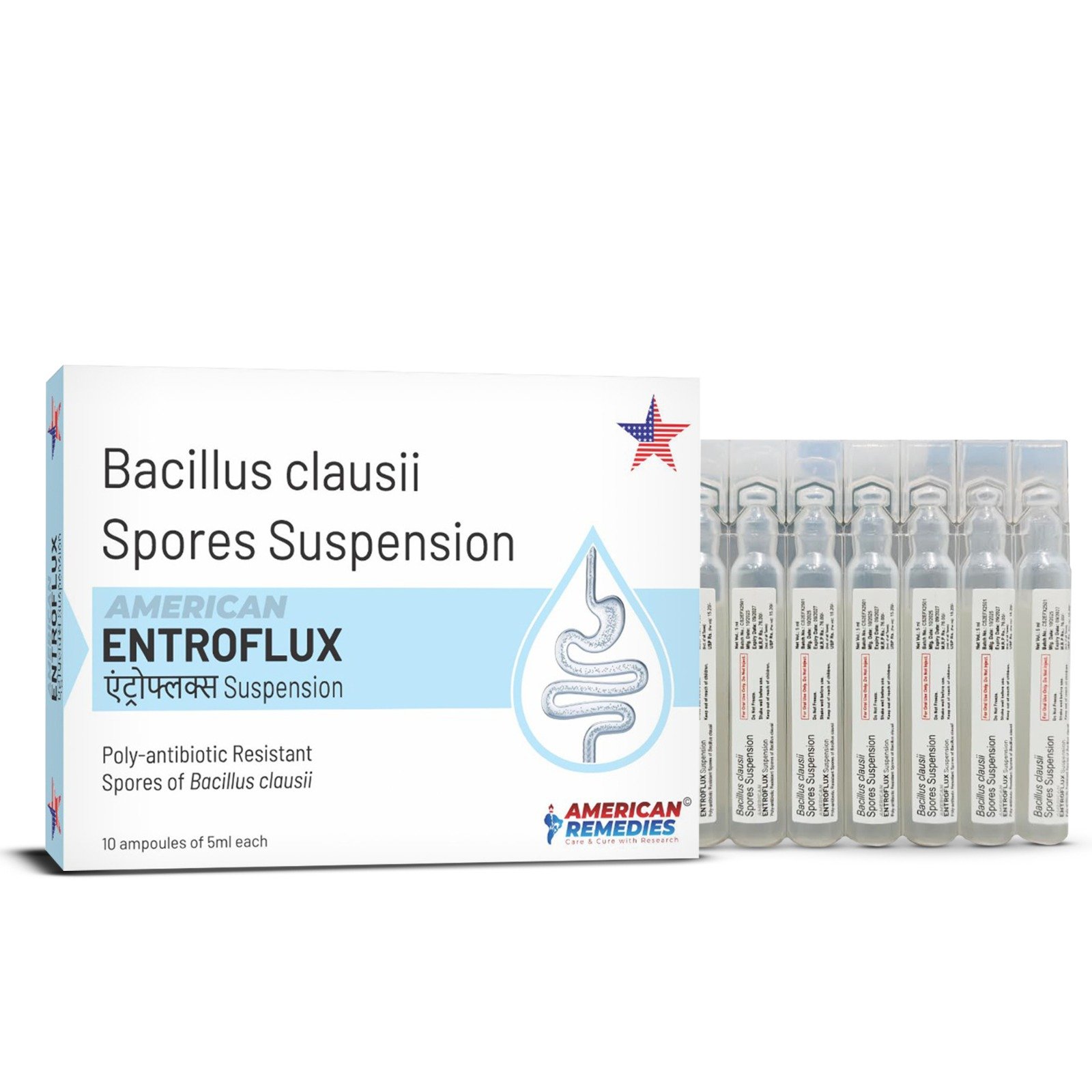 ENTROFLUX contains Bacillus Clausi Spores suspension is used as a probiotic to restore and maintain the natural balance of gut bacteria, which helps with issues like diarrhea, bloating, and other digestive discomforts