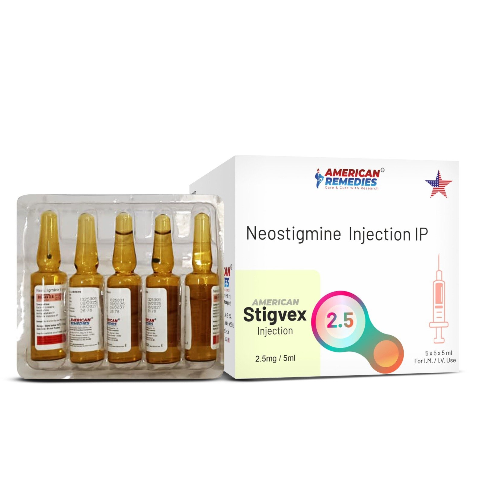 STIGVEX 2.5 contains Neostigmine which is used to treat muscle weakness in myasthenia gravis, reverse muscle paralysis after surgery, and manage urinary retention or intestinal issues like ileus by enhancing nerve-muscle communication.
